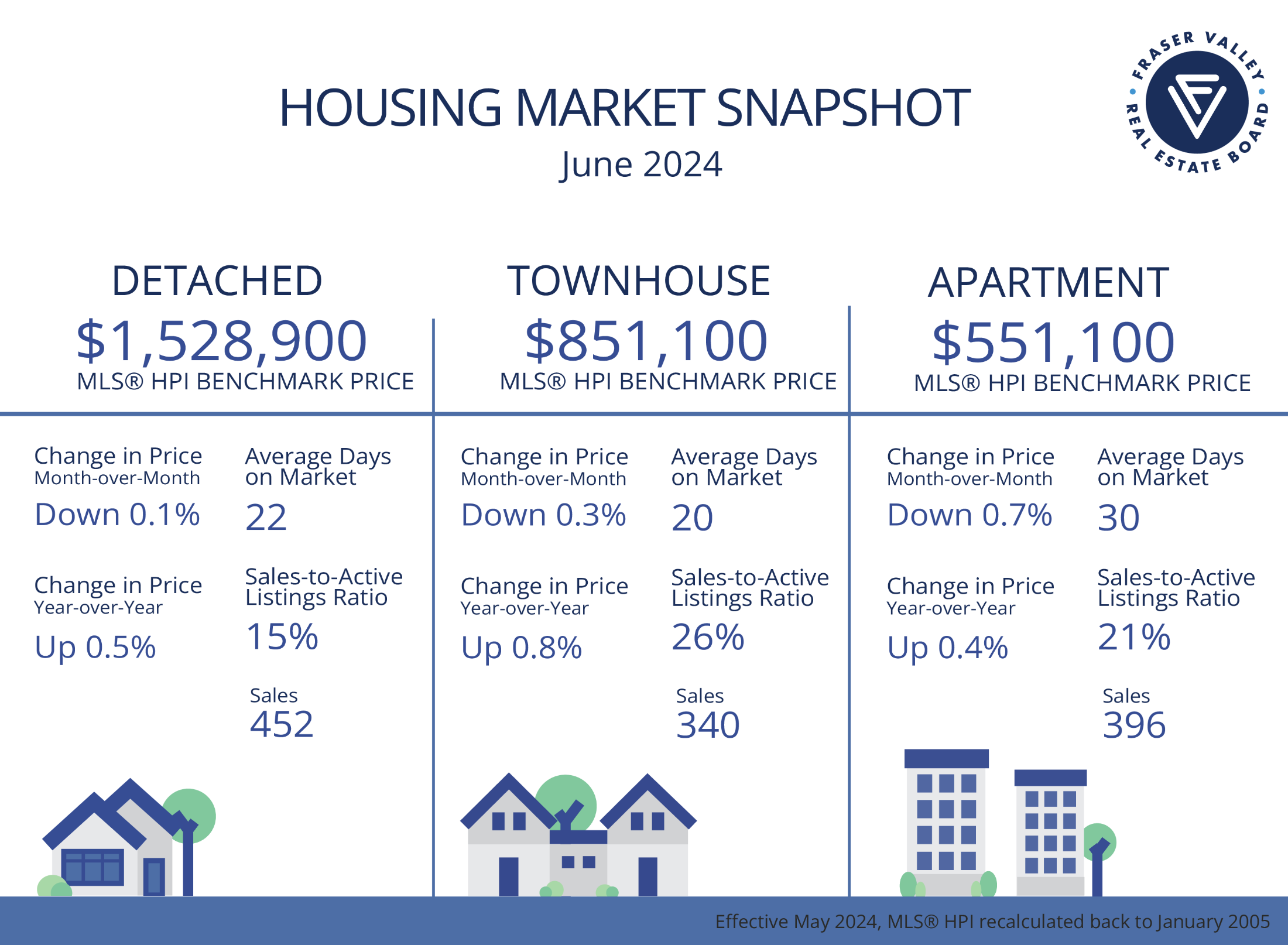 Benchmark prices in the Fraser Valley remained relatively flat in June, with the composite Benchmark price down 0.5 percent from May and down 3.2 percent from June 2023.